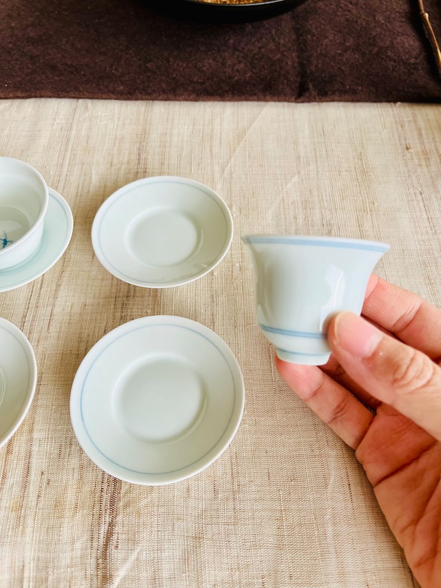 サイズ 63×63×32mm 容 量 30cc 外側にはブルーの細いライン、内側の底には蘭の花が描かれています。お茶を飲み終えたとき、杯の底に静かに現れる花。そういう小さな仕掛けが、お茶の時間をすこし豊かにしてくれます。 青白磁ならではの青みがかった白と、ブルーのラインの組み合わせが上品で、茶席に品を添えます。 30ccの小ぶりなサイズで、工夫茶スタイルに。来客時にも、自分だけのお茶時間にも。 同じデザインの聞香杯、茶托もあります。 台湾・鶯歌「風清堂」の茶杯です。