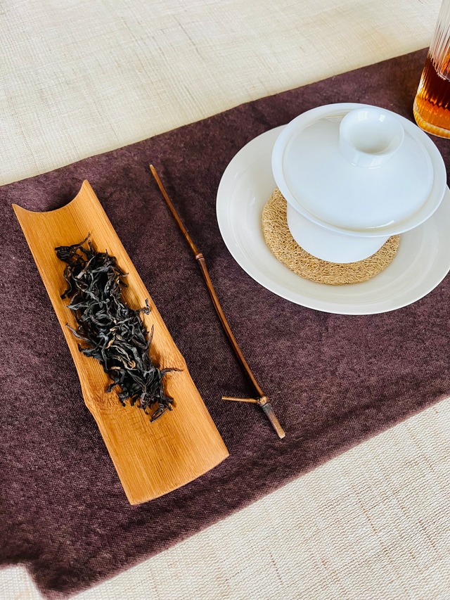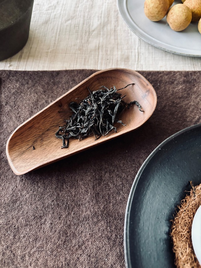 材 質:胡桃 サイズ:約19×5.5cm 茶葉をのせて香りや形を楽しむための茶荷です。 お茶を淹れる前に茶葉を茶荷に移し、 香りや葉の状態を確かめながら茶壺や蓋碗に移します。 胡桃の木で作られており、 やわらかな木の質感と温かみのある色合いが特徴です。 表面には削った跡が残されており、 手作りならではの自然な風合いを楽しむことができます。 深みのある木の色は茶葉の緑を美しく引き立て、 茶席の雰囲気をより豊かにしてくれます。 茶葉を扱う道具としてはもちろん、 茶席のアクセントとしてもおすすめです。 ※天然素材のため色味や木目には個体差があります。