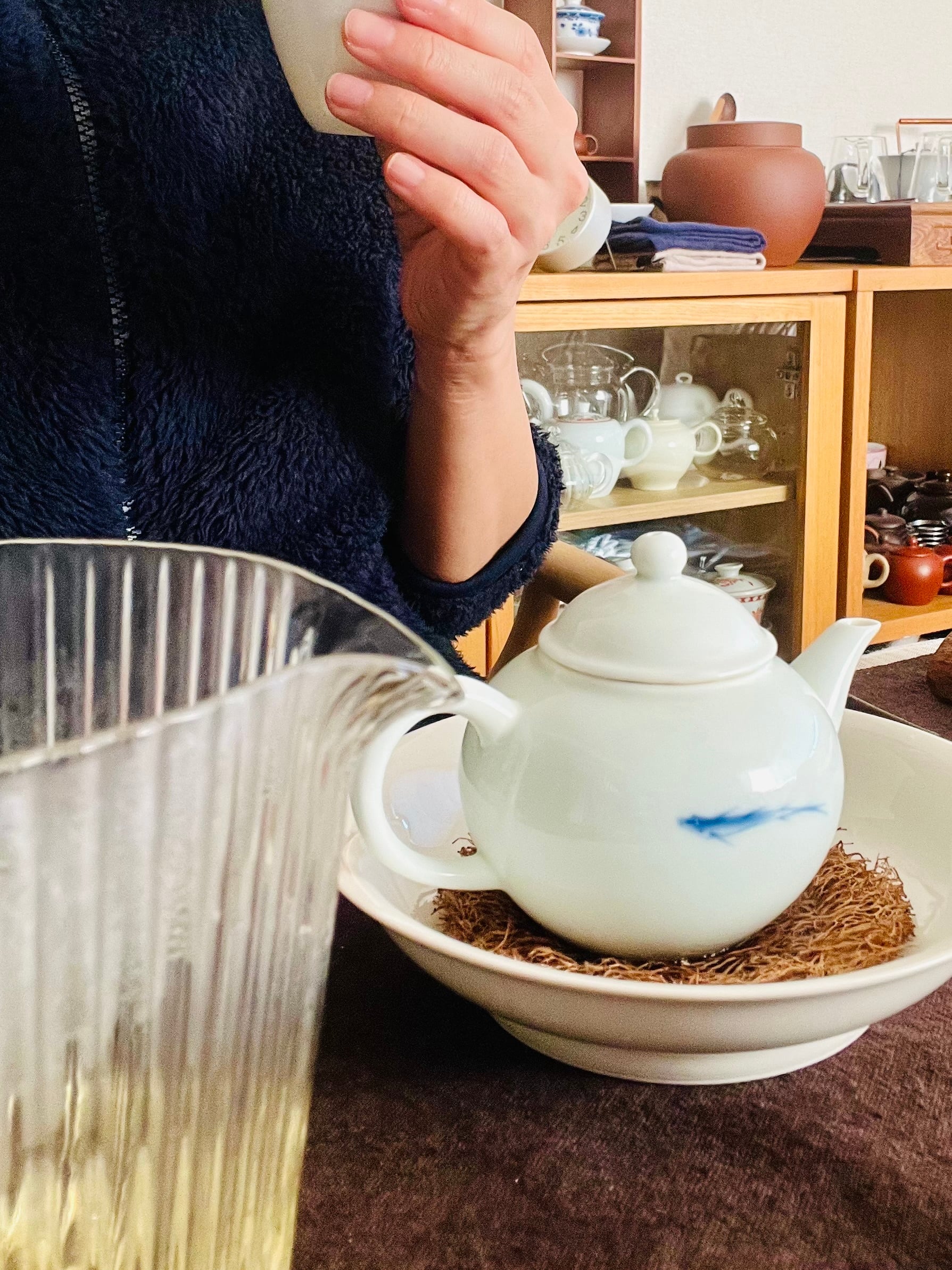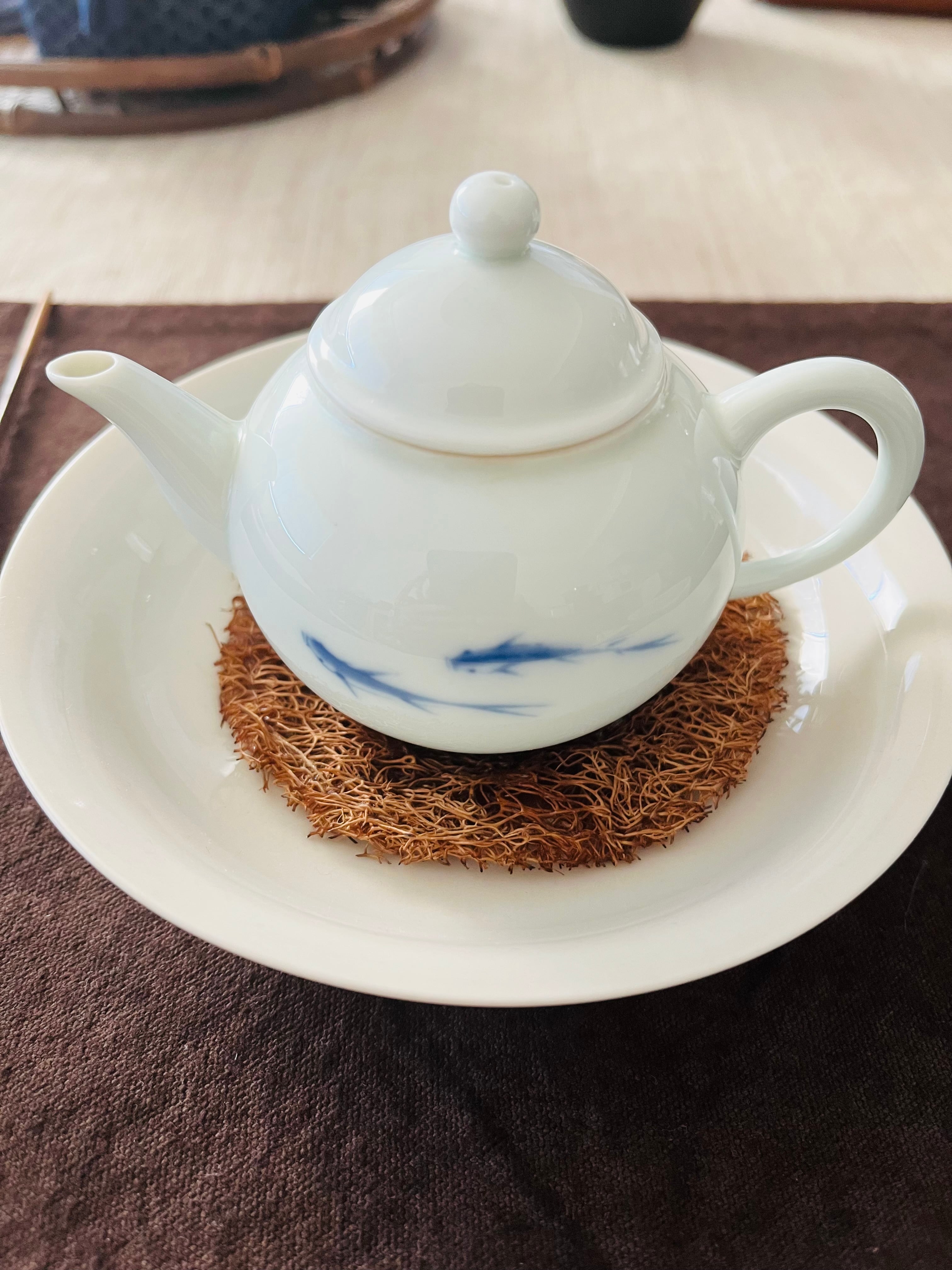 青白磁の地に、職人が筆で描いた魚。泳いでいるような、漂っているような—。余白の多いシンプルな絵柄だからこそ、使うほどに愛着が湧いてくる茶壺です。