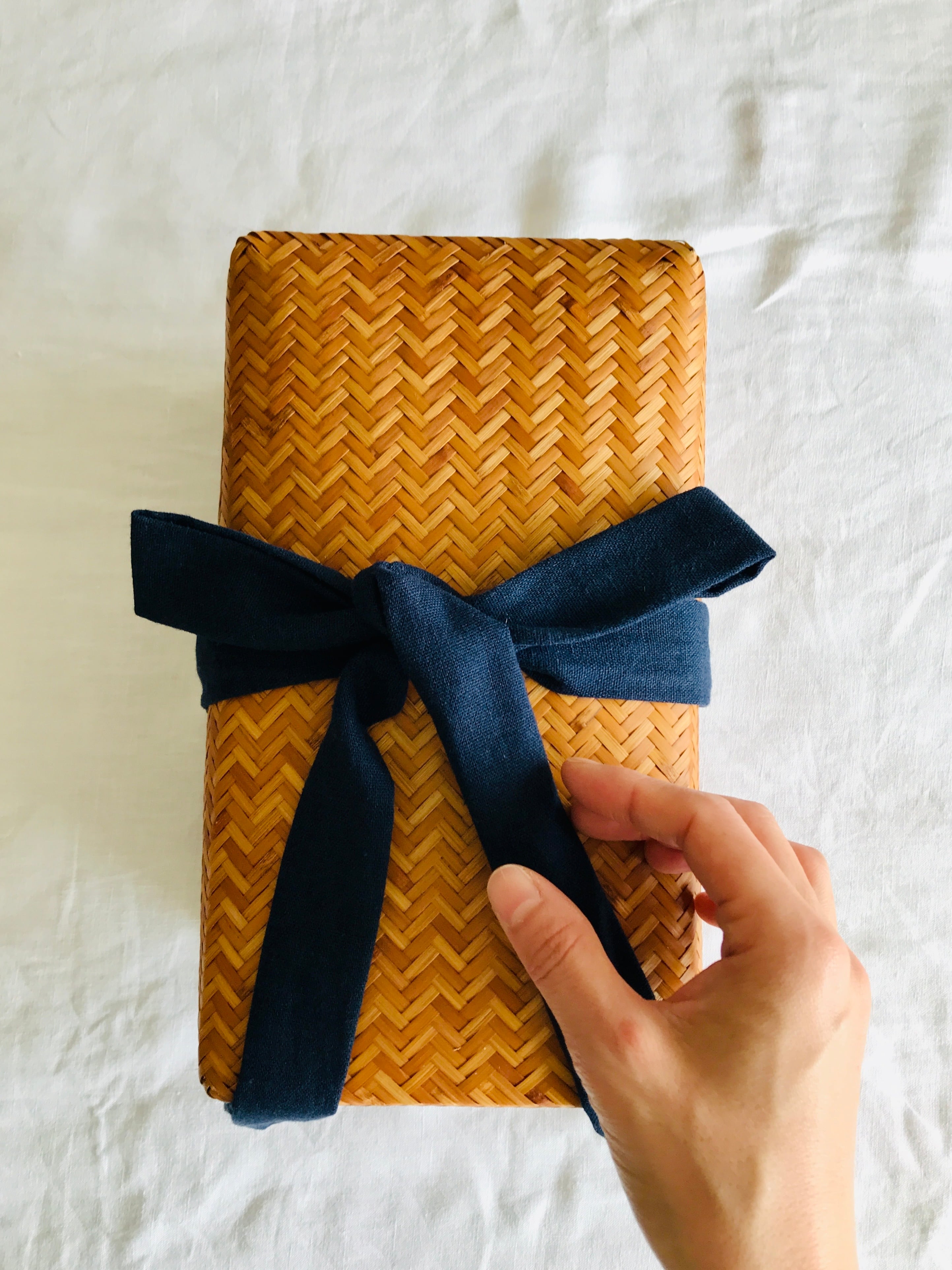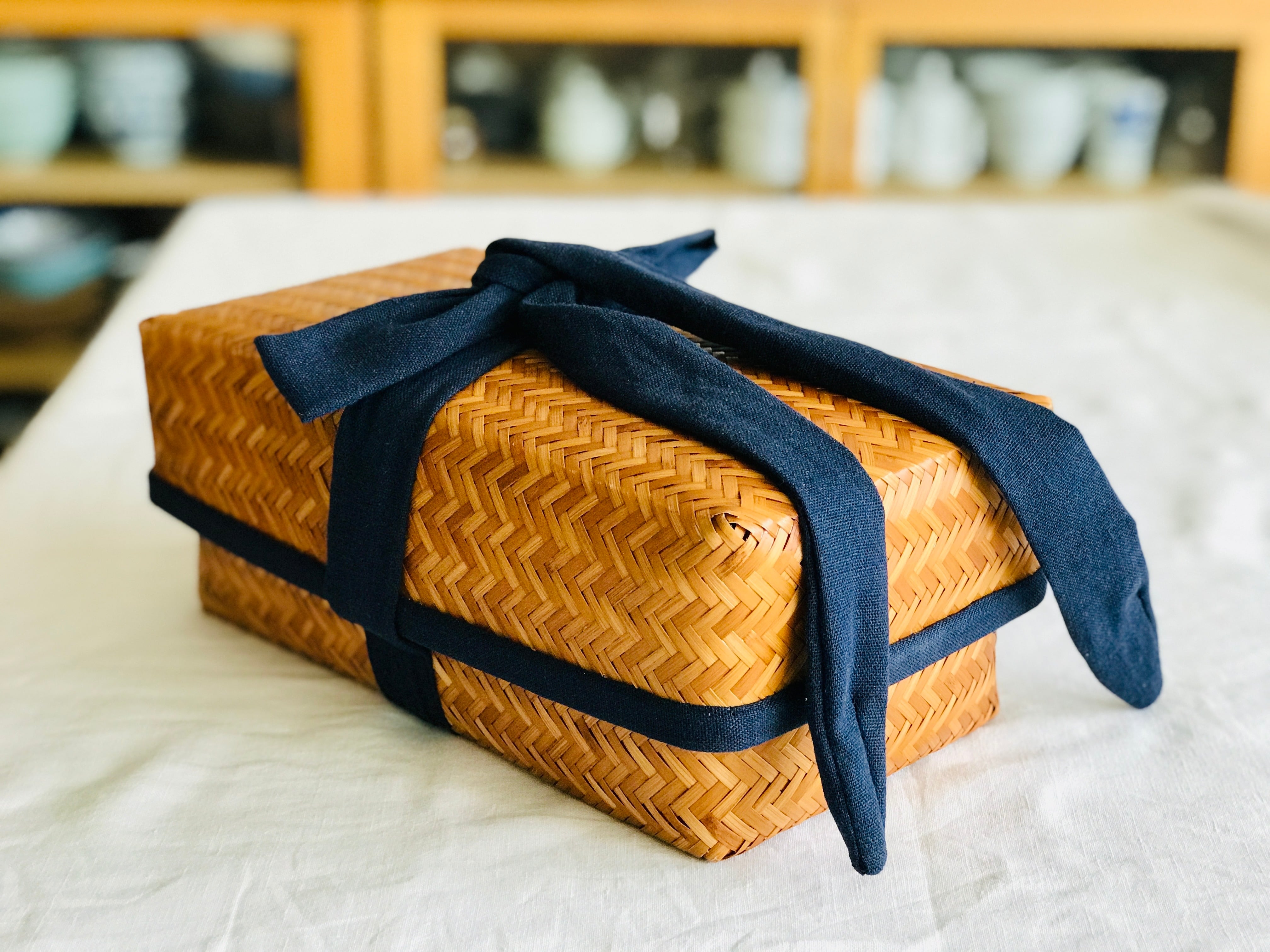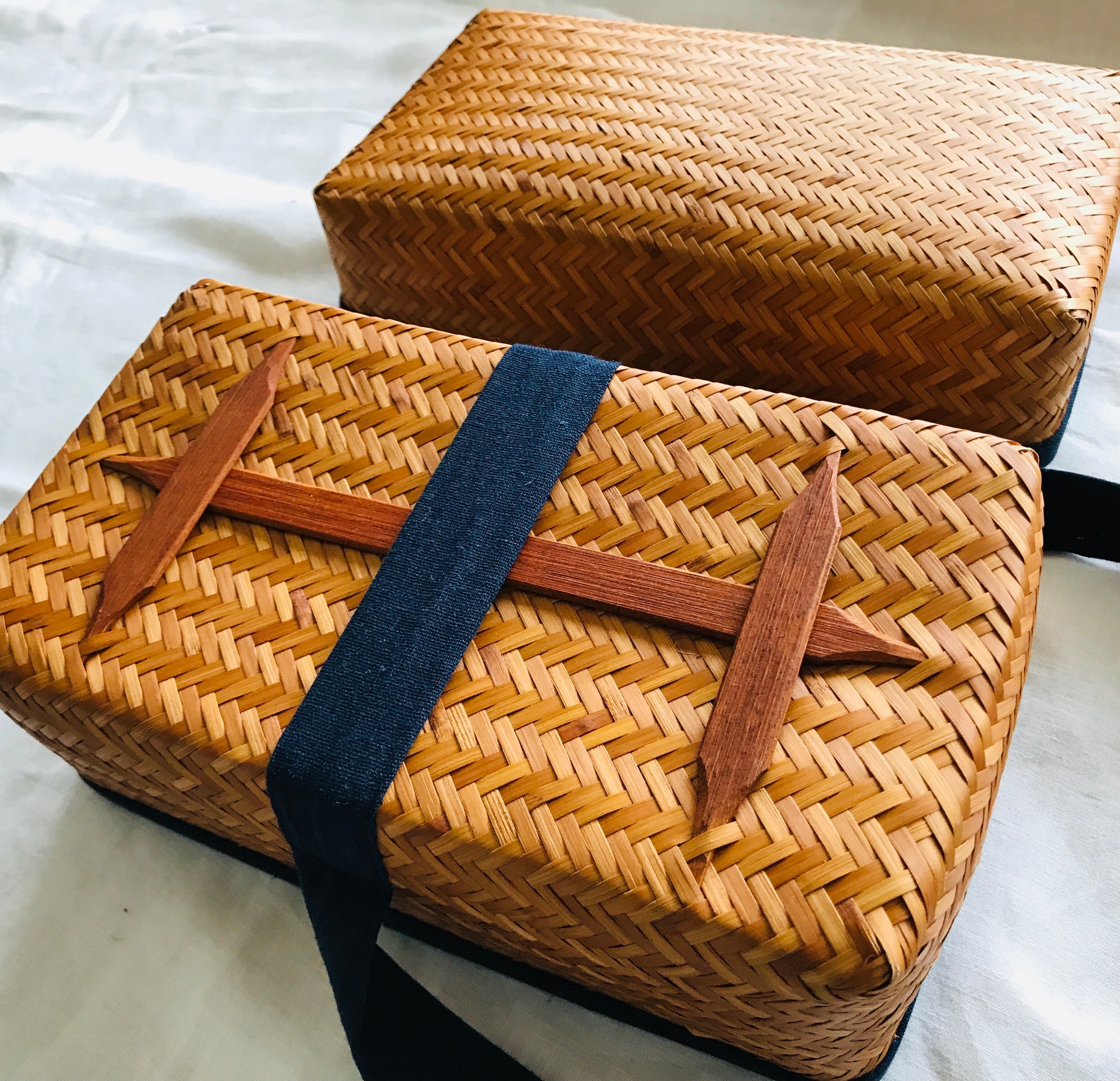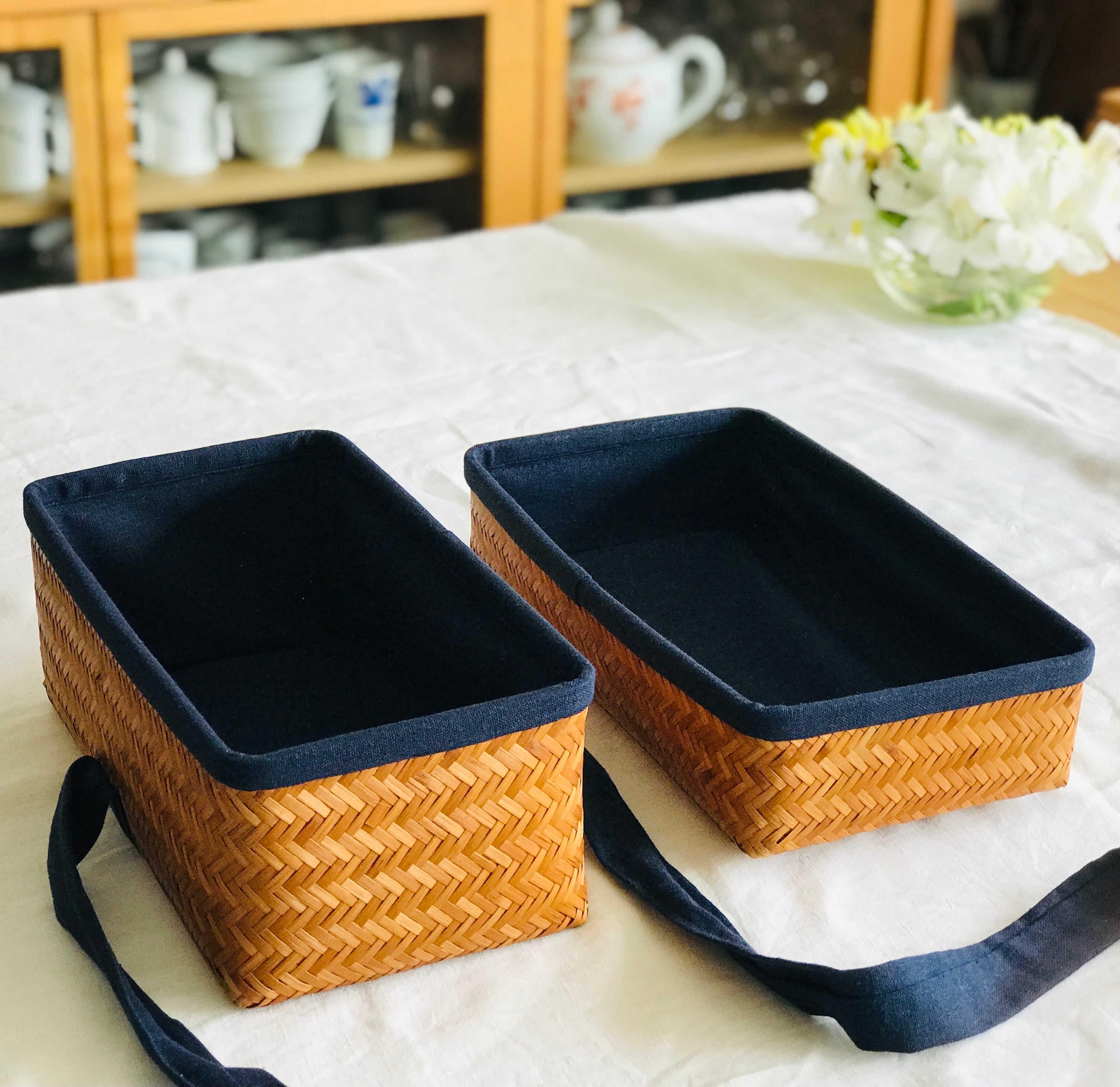 竹製の蓋付きカゴです。紺色の紐付。中は布張りなので引っかかりなく大切なものを収納できます。