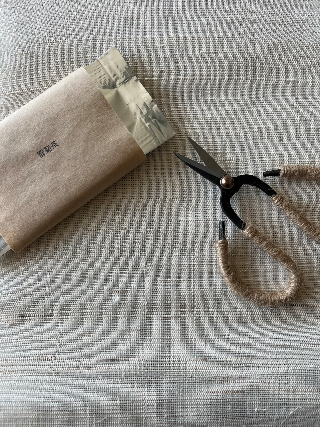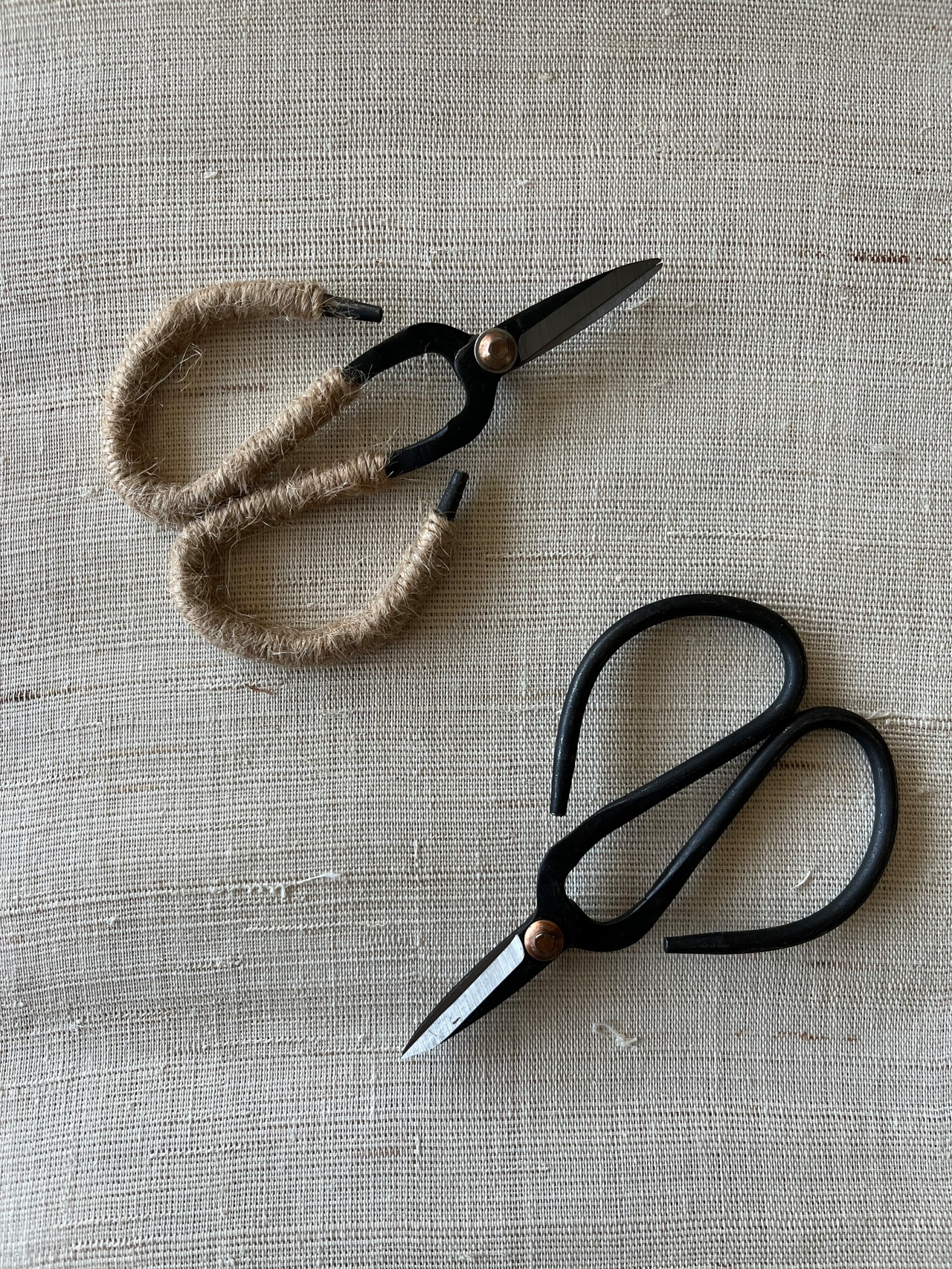 黒のハサミの持ち手部分に麻紐が巻かれています