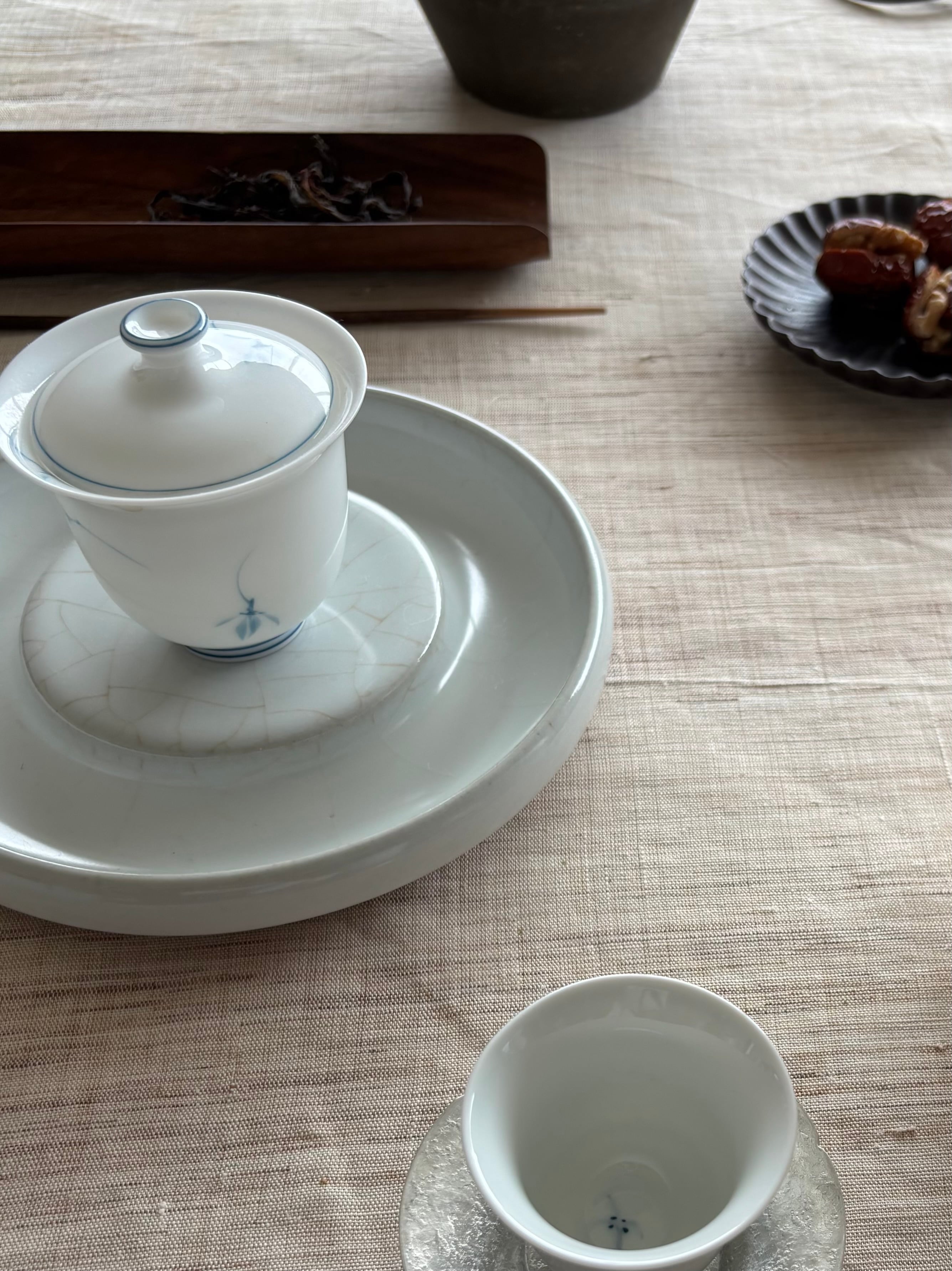 容量70ccは、白磁小蓋碗よりさらに小さく、繊細なサイズ。シンプルな白磁の蓋碗を日常使いにしているなら、これはそのとなりに置きたい一客です。少し特別なお茶の時間に、あるいは自分へのご褒美に。
